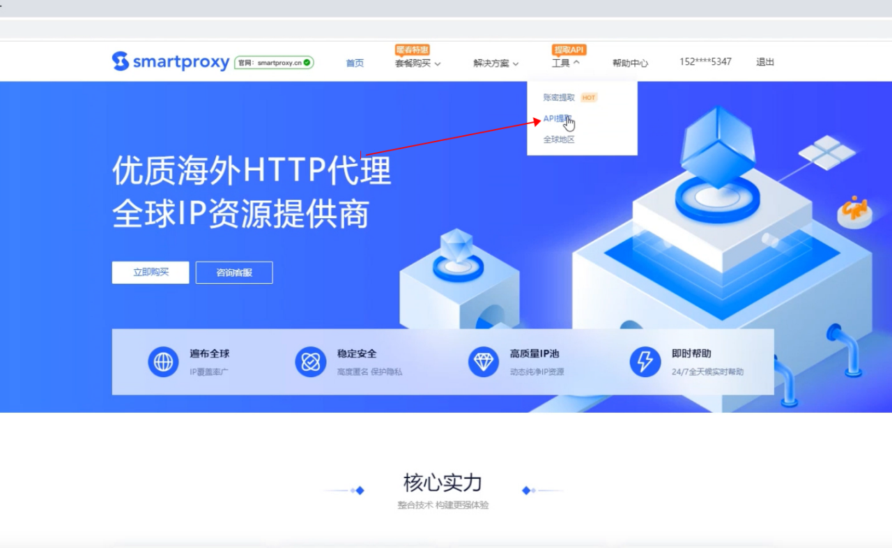 1.打开Smartproxy并登录账号,点击工具栏中的API提取。