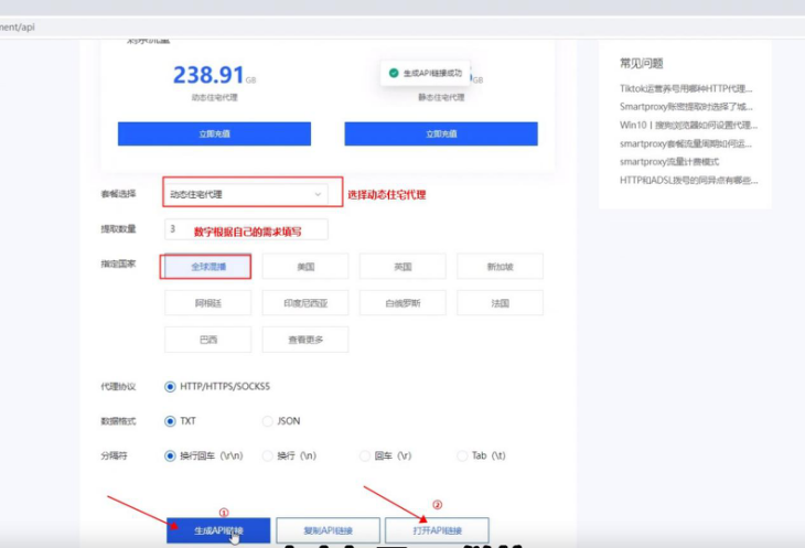 2.选择动态住宅代理,根据自己的需求填写提取数量,然后依次点击生成API链接—打开API链接。
