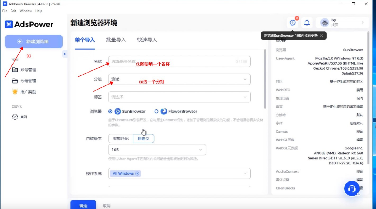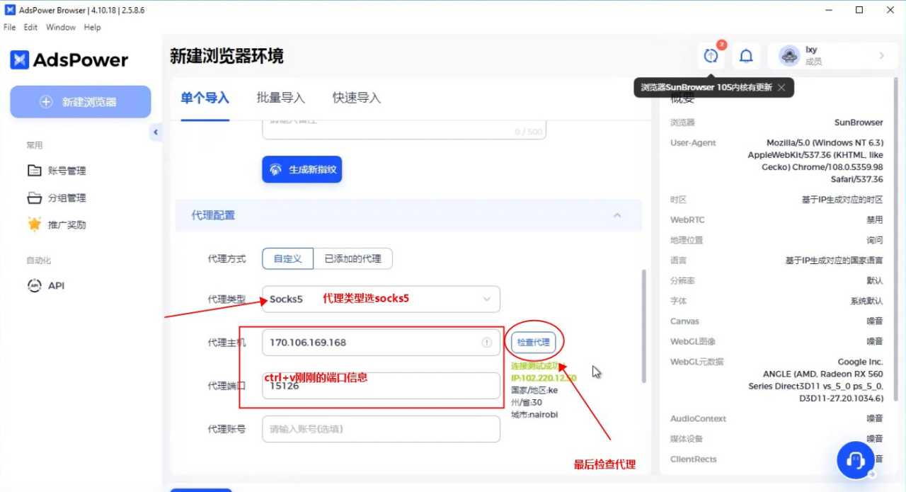 4.打开AdsPower,点击新建浏览器,填入名称并选择分组,然后选择代理类型、复制粘贴之前的端口信息,如下图所示。